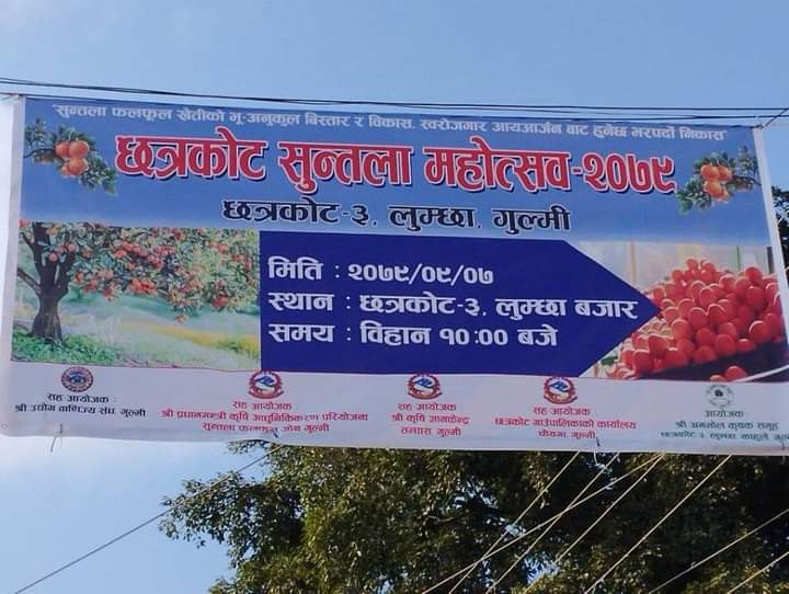 सुन्तला खेतीको भू–अनुकूल विस्तार र विकास, स्वरोजगार आयआर्जनबाट हुनेछ भरपर्दो निकास भन्ने नाराका साथ सुन्तलाको प्रदर्शन, सुन्तलाबाट बन्ने परिकारको प्रदर्शनी र विभिन्न प्रतियोगिताका साथ महोत्सव गरिएको हो ।