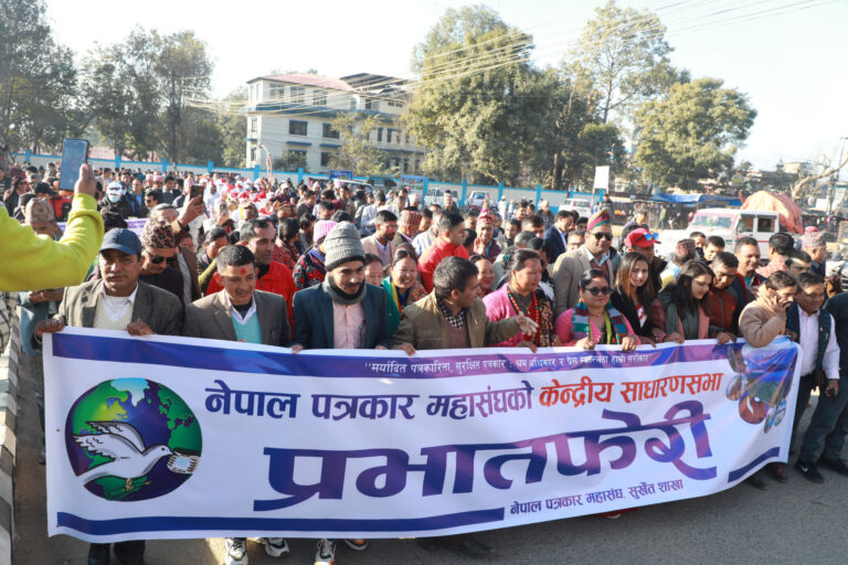 काठमाडौँ,८ पुष । नेपाल पत्रकार महासङ्घको सुर्खेतमा हुने दुईदिने केन्द्रीय साधारणसभाका अवसरमा शुक्रबार आयोजित प्रभातफेरीमा सहभागी पत्रकार । तस्बिर : रत्न श्रेष्ठ/ रासस