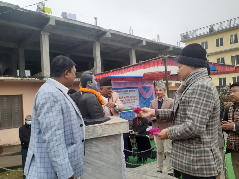 काठमाडौँ,८ पुष । व्यास नगरपालिका–१ बिज्ञानचौरस्थित आदिकवि भानुभक्त क्याम्पस परिसरमा निर्माण गरिएको सहीद चन्द्रबहादुर नेपालीको सालिक अनावरण गर्दै गण्डकी प्रदेशका आन्तरिक मामिलामन्त्री डोवाटे विकलगायतका अथिति । २००७ सालको क्रान्तिमा सहादत प्राप्त गरेका नेपालीको नाउँमा स्थापना गरेको उक्त छात्राबासमा हाल बत्तीस जना छात्रा बसेर सहज रुपमा अध्ययन गर्दै आएका छन् । तस्बिर : सानेबहादुर नेपाली /रासस