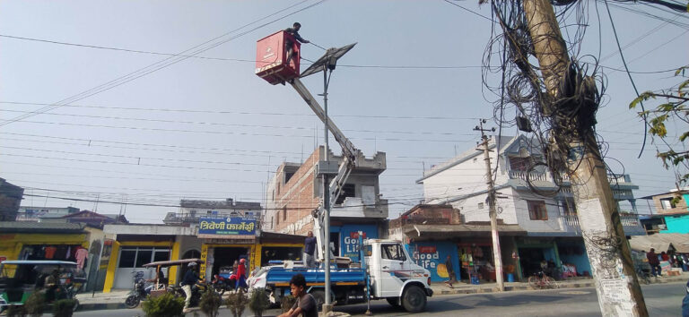 काठमाडौँ,११ पुष । विराटनगर–१ स्थित त्रिवेणी मार्गमा क्रेनमा चढेर सौर्य सडक बत्तीको सफाइ गर्दै विराटनगर महानगरपालिकाका कर्मचारी । पछिल्लोपटक विराटनगर महनगरपालिकाले नगर सौन्दर्यीकरणका लागि सरसफाइ अभियान सञ्चालन गरेको छ । तस्बिर : अनुज सापकोटा/रासस