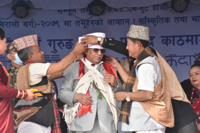 प्रधानमन्त्री दाहाल पनि आज प्रमुख अतिथिको रुपमा टुँडिखेल पुगेका हुन् । गुरुङ समुदायले पुरानो वर्षलाई बिदाई गर्दै नयाँ वर्षलाई स्वागत गरेर ‘तमू ल्होसार’ मनाइरहेका छन् । ‘ल्हो’ को अर्थ वर्ष र ‘सार’ को अर्थ फेरिनुभएकाले वर्ष फेरिने दिनलाई ‘तमू ल्होसार’ भनिएको हो । ल्होसारको अवसरमा आज टुँडिखेलमा विभिन्न झाँकी निकालिएको थियो । उनीहरु आफ्नो भेषभुषामा सजिएका थिए ।