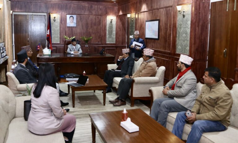 काठमाडौँ,२१ पुष । कम्बोडिया ग्राण्ड डायमण्डसिटी र क्यासिनोमा भएको आगलागीमा परी गत बिहीबार मृत्यु भएका निराकार पाण्डेका बुवा अग्नि पाण्डेसँग बिहीबार प्रधानमन्त्री तथा मन्त्रिपरिषदको कार्यालयमा भेट गर्नुहुँदै प्रधानमन्त्री पुष्पकमल दाहाल (प्रचण्ड) । भेटमा उपस्थित मन्त्रीलगायत । तस्बिरः प्रदीपराज वन्त/रासस