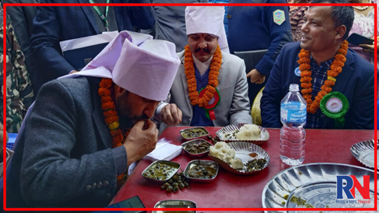 महोत्सव उद्घाटनपश्चात थारु समुदायको विशेष परिकार घोङ्गी खाँदै गृहमन्त्री रबि लामिछाने(तस्बिर : राजु चौधरी)