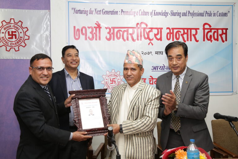 काठमाडौं, १२ माघ । नेपाल चेम्बर अफ कमर्सले ७१ औं अन्तराष्ट्रिय भन्सार दिवसका अवसरमा भन्सार विभागका निर्देशक डा राम मैनालीलाई सम्मान गरेको छ । भन्सार विभागमा रहेर उत्कृष्ट सेवा गरेको भन्दै चेम्बरले निर्देशक रेग्मीलाई सम्मान गरेको हो ।