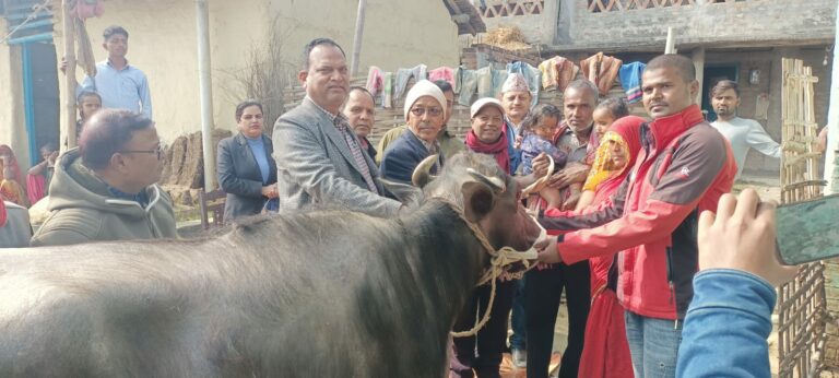 बख्तियार अली : सर्लाही, १८ माघ । तिम्ल्याहा बच्चालाई जन्मदिएका खुटौनाका एक दम्पतीलाई स्वरोजगारीको लागि मलंगवा नगरपालिकाले भैसी उपहार दिएको छ।मलंगवा नगरपालिका-६ खुटौनाका दम्पती जितेन्द्रकुमार यादव र गितादेवी यादवलाई बिहीबार उनकै घरमा पुगेर भैसी उपहार दिइएको हो।