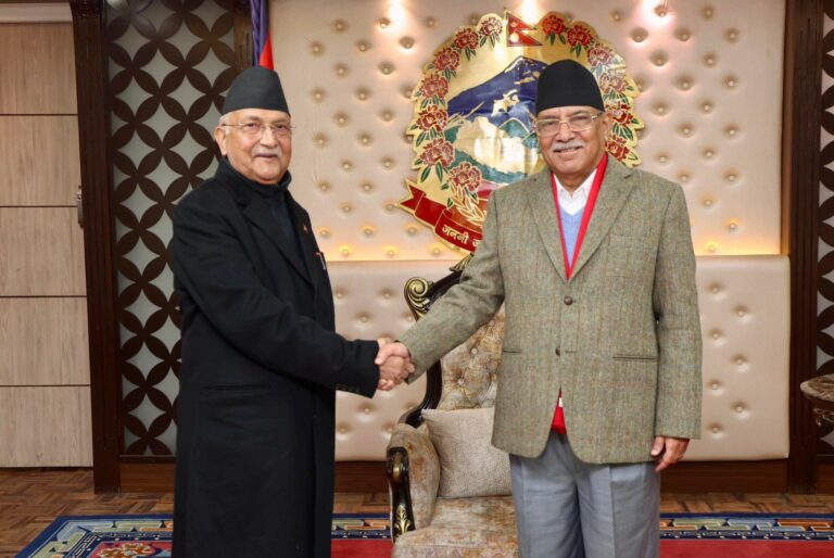 काठमाडौं, माघ २१ । नेकपा (एमाले)का अध्यक्ष केपी शर्मा ओलीले प्रधानमन्त्री पुष्पकमल दाहाल ‘प्रचण्ड’सँग भेटवार्ता गरेका छन्। शनिबार बिहान प्रधानमन्त्रीको सरकारी निवास बालुवाटार पुगेर अध्यक्ष ओलीले प्रधानमन्त्री प्रचण्डसँग भेटवार्ता गरेका हुन्।