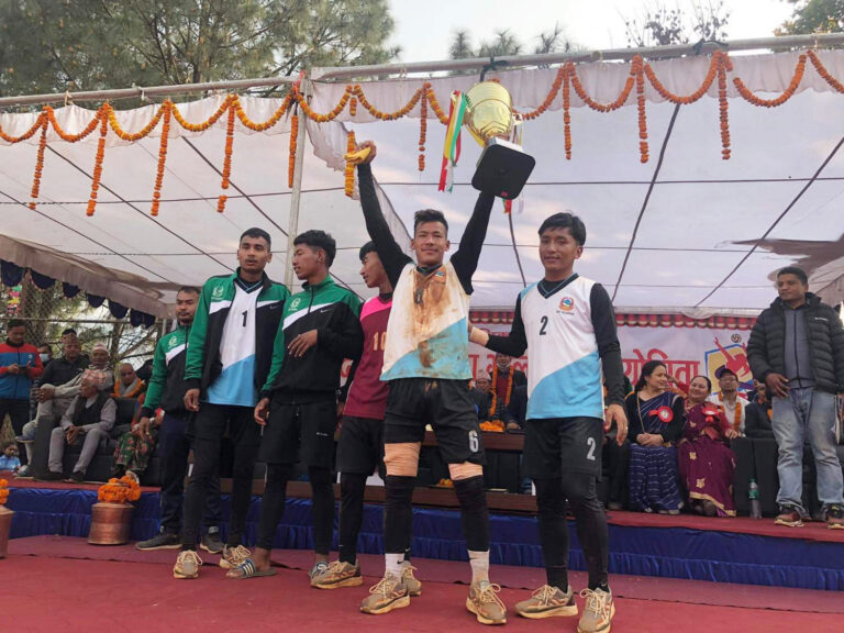 काठमाडौँ,२२ माघ । ‘नुवाकोट जिल्ला अन्तर पालिकास्तरीय प्रथम तादी अध्यक्ष कप भलिबल प्रतियोगिता’को उपाधि बिजेता म्यागङ गाँउपालिकाको कप्तान आइत तामाङसहितको टिम । शनिबार भएको फाइनलमा आयोजक तादीलाई हराउँदै म्यागङले रु एक लाख ५० हजार नगदसहित शिल्ड, मेडल र प्रमाणपत्र प्राप्त ग¥यो । दोश्रो भएको तादीले रु एक लाख र तेश्रो भएको पञ्चकन्याले रु ५० हजार पाएको छ । तस्बिर : रामहरि न्यौपाने/रासस
