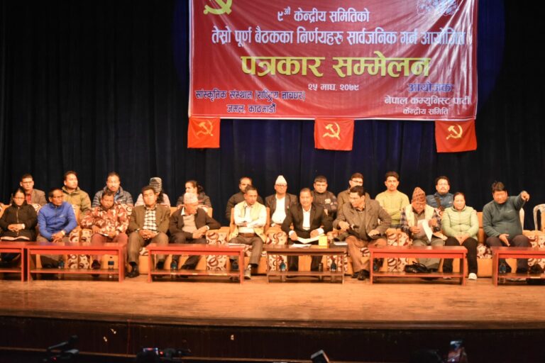 काठमाडौं, २५ माघ । नेपाल कम्युनिस्ट पार्टीका महासचिव नेत्रबिक्रम चन्द ‘विप्लव’ले आज राष्ट्रिय नाँचघरमा पत्रकार सम्मेलनको आयोजना गर्दै ९ औं केन्द्रीय समितिको तेस्रो पूर्ण बैठकका निर्णयहरु सार्वजनिक गरेका हुन्।