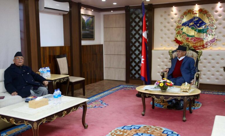 बैठक नबसेपनि प्रधानमन्त्री पुष्पकमल दाहाल ‘प्रचण्ड’ र एमाले अध्यक्ष केपी शर्मा ओलीबीच अहिले सिंहदरबारमा छलफल चलिरहेको छ।