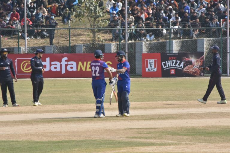 यसअघि नेपालले पहिलो विकेटको रुपमा आशिफ शेख र ज्ञानेन्द्र मल्ललाई गुमाएको थियोभने तेस्रो विकेटकारुपमा कप्तान रोहित पौडेल र चौथो विकेटका रुपमा कुशल मल्ललाई गुमाएको हो।