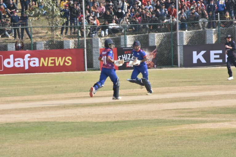 नेपालका लागि कुशल भुर्तेलले ११० बलमा १०६ रन जोड्दै क्रिजमा रहेका छन् भने उनलाई सन्दिप जोराले १८ बलमा २० रन जोड्दै सघाइरहेका छन्।