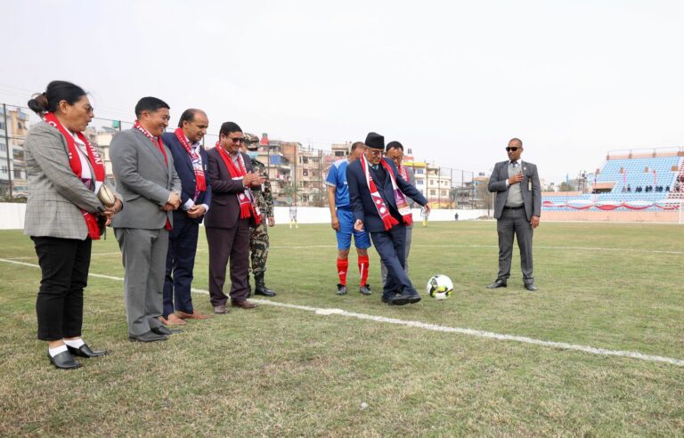 काठमाडौं, १६ फागुन। प्रधानमन्त्री पुष्पकमल दाहाल ‘प्रचण्ड’ले आज फुटबल खेल्दै च्यासल रंगशलाको उद्घाटन गरेका छन्।