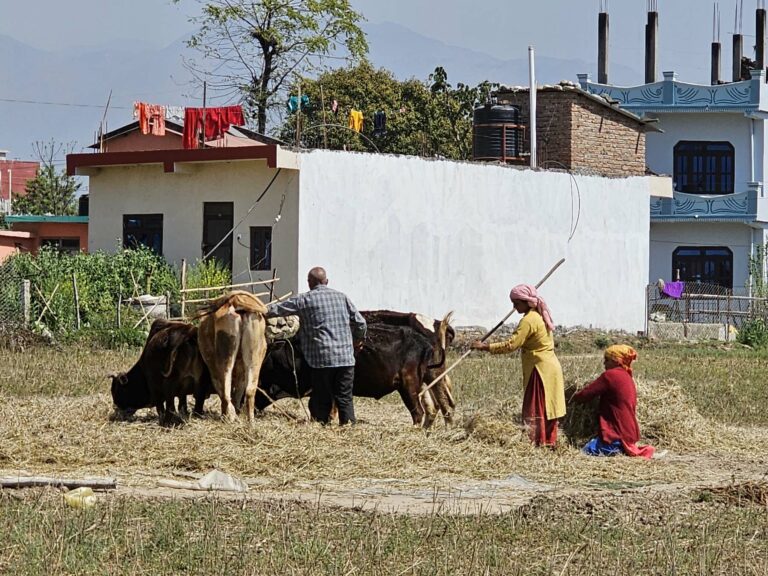 सुर्खेत २१ फागुन । सुर्खेतको वीरेन्द्रनगर– ४ मसुरि खेतमा तोरी दाइँ गर्दै कृषक ।