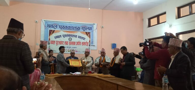 पाल्पा, २८ फागुन । धवल पुस्तकालय तानसेन पाल्पाले प्रदान गर्दै आएको धवल दीर्घ साधना पुरस्कार वरिष्ठ साहित्यकार शशि पन्थी र धवल सिर्जना पुरस्कार कृष्ण उपन्यासका लेखक डा. शङ्करप्रसाद गैरेलाई अर्पण गरिएको छ । सो पुरस्कारको राशी नगद रु २५ हजारसहित सम्मानपत्र रहेको छ ।
