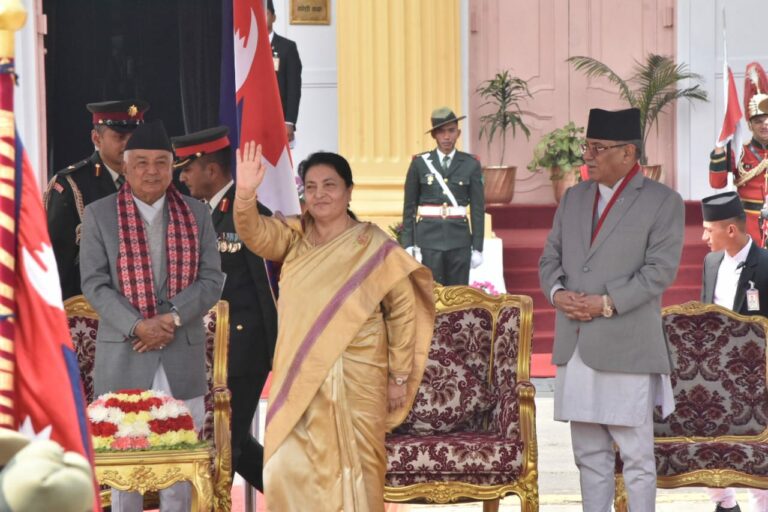 काठमाडौं, २९ फागुन । नव निर्वाचित राष्ट्रपति रामचन्द्र पौडेल र प्रधानमन्त्री पुष्पकमल दाहाल ‘प्रचण्ड’ ले निवर्तमान राष्ट्रपति विद्यादेवी भण्डारीलाई विदाई गरेका छन् । उनलाई गाडीसम्मै पुर्याएर नवनिर्वाचित राष्ट्रपति पौडेलले विदाईमा आफ्नो सादगीपना प्रस्तुत गरेका छन् । पौडेलको सादगीपनालाई समारोहमा उपस्थित विशिष्ट व्यक्तित्वहरुले प्रसंशा गरेका थिए ।