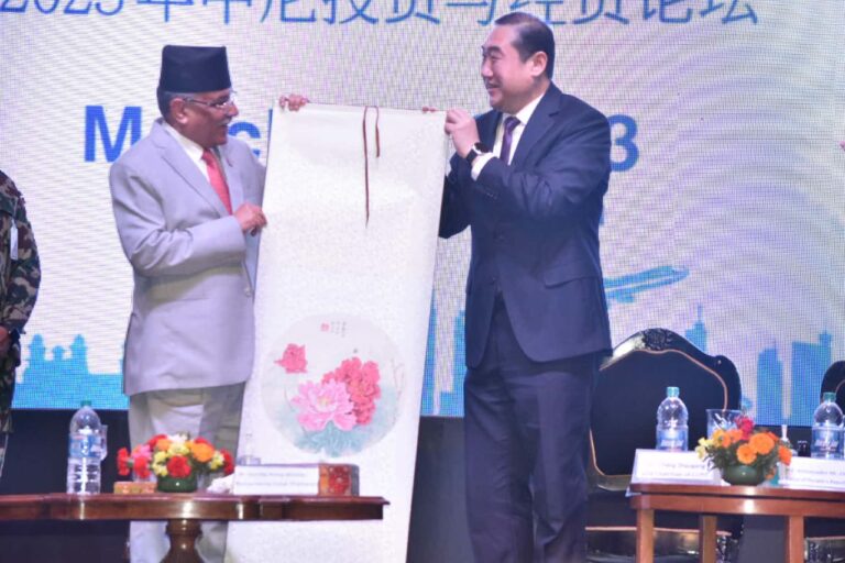‘नेपाल र चीनका प्रमुख व्यापारिक नेताहरूमाझ आउन पाउनु मेरो लागि खुसीको कुरा हो। हामी हाम्रो नजिकको, मित्रवत छिमेकी चीनबाट उच्च(स्तरीय व्यापार प्रतिनिधिमण्डल प्राप्त गर्न पाउँदा खुसी छौं। यस फोरमले विद्यमान व्यापारिक सम्बन्धलाई सुदृढ गर्न र नेपाल र चीनबीचको आर्थिक तथा व्यापारिक साझेदारीका नयाँ क्षेत्रहरू खोज्ने उत्कृष्ट अवसर प्रदान गरेको मलाई विश्वास छ,’– उनले भने ।
