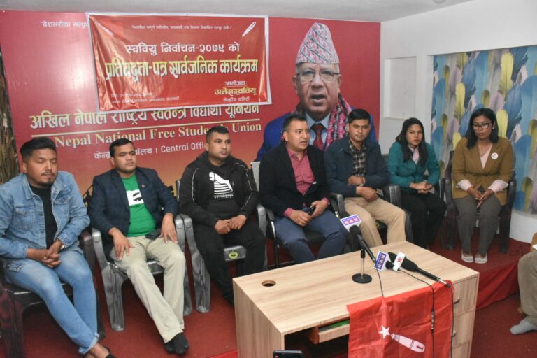 काठमाडौं, १ चैत्र । अखिल नेपाल राष्ट्रिय स्वतन्त्र विद्यार्थी यूनियनले स्ववियु निर्वाचन-२०७९ को लागि आज घोषणापत्र सार्वजनिक गरेको छ । घोषणापत्रमा स्ववियुलाई आमविद्यार्थीहरुको साझा संस्था बनाईने, विश्वविद्यालय र क्याम्पसमा हुने राजनीतिक भागबण्डाको अन्त्य गरिने प्रतिबद्धता जनाईएको छ ।
