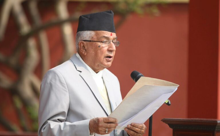काठमाडौं, ४ चैत्र । राष्ट्रपति रामचन्द्र पौडेलले नेपालको राष्ट्रिय एकताको प्रवद्र्धन, स्वाधीनताको रक्षा, संविधानको पालना र संरक्षण गर्ने संवैधानिक जिम्मेवारी नै आफ्ना मार्गनिर्देशक सिद्धान्त रहने बताएका छन्। राष्ट्रपतिमा निर्वाचित भएपछि सङ्घीय सांसद र प्रदेशसभा सदस्यलाई राष्ट्रपति कार्यालयमा साक्षात्कार तथा धन्यवाद दिन आज आयोजित समारोहमा उनले राष्ट्रपतिका काम, कर्तव्य तथा जिम्मेवारी वहन गर्दा संविधानप्रदत्त मर्यादा तथा संविधानका अक्षर र भावनालाई आत्मसात् गरी दिगो शान्ति, सुशासन, विकास र समृद्धिको आकाङ्क्षा पूरा गर्ने राष्ट्रिय अभियानमा सरिक हुन सदैव तत्पर रहने उल्लेख गरे।