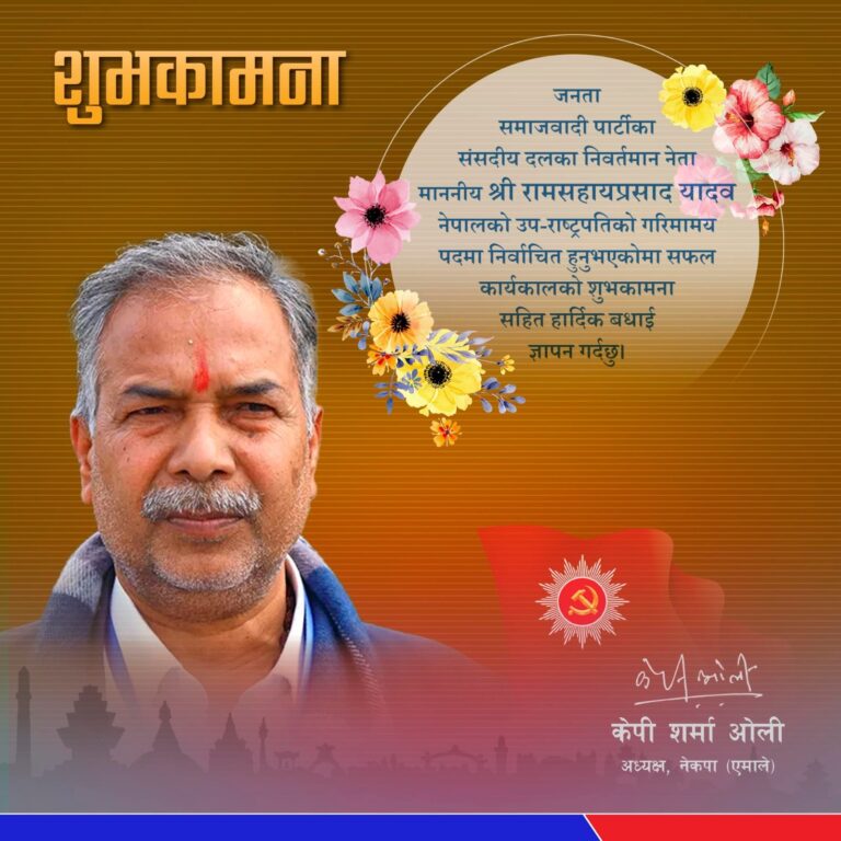 ६ चैत काठमाडौं । नवनिर्वाचित उपराष्ट्रपति रामसहायप्रसाद यादवलाई नेकपा एमालेका अध्यक्ष केपी शर्मा ओलिले बधाई तथा सफल कार्यकालको शुभकामना दिएका छन । उपराष्ट्रपति यादवले पद तथा गोपनियताको सपथ लिएलगत्तै ओलिले फेसबुक मार्फत शुभकामना दिएका हुन ।