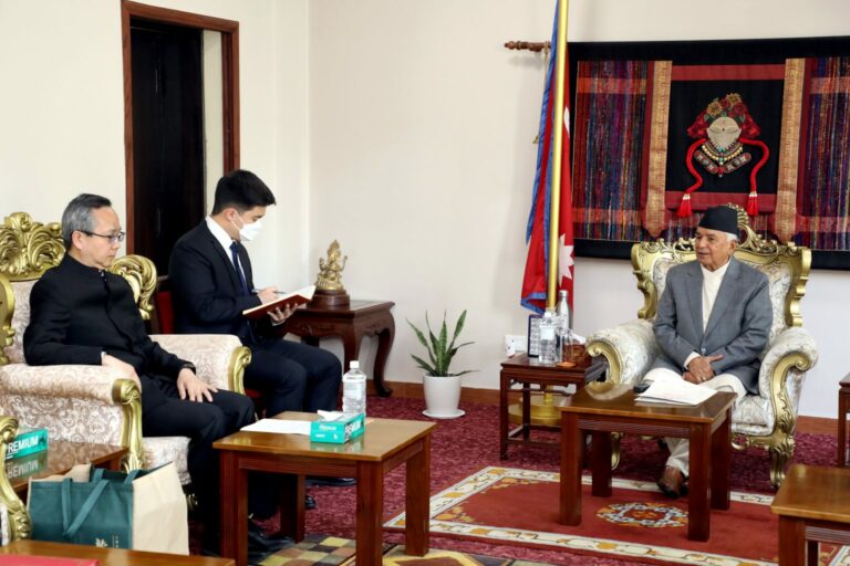 काठमाडौं ८ चैत्र । नेपालका लागि चीनका राजदूत चेन सङले राष्ट्रपति रामचन्द्र पौडेलसँग शिष्टाचार भेटवार्ता गरेका छन् । राजदूत सङले बुधवार राष्ट्रपति भवन शीतलनिवासमा राष्ट्रपति पौडेलसँग शिष्टाचार भेटवार्ता गरेका हुन् । भेटमा नेपाल र जनवादी गणतन्त्र चीनबीच रही आएको द्विपक्षीय सम्बन्ध, पारस्परिक हित र चासोका बिषयमा कुराकानी भएको राष्ट्रपति कार्यालयका प्रवक्ता सागर आचार्यले जानकारी दिए ।