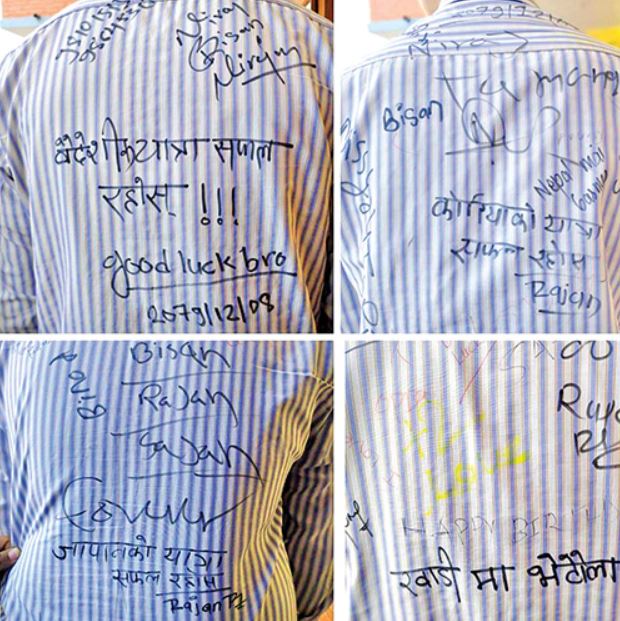 काभ्रेपलाञ्चोकको तिमाल घर भएका निराजन मैनालीले बुधबार विद्यालयमा आयोजित कक्षा १२ को बिदाइ कार्यक्रममा आफ्ना साथी निरज तामाङको पिठ्यूँमा ‘खाडीमा भेटौंला’ भन्ने सन्देश लेखेका हुन्। ‘साथीले मेरो सर्टमा जापानको यात्रा सफल रहोस् भनेर लेखे,’ मैनालीले भने, ‘तर मलाई त्यो विश्वास लागेन, त्यसैले खाडीमा भेटौंला भनेर उसको सर्टमा लेखें।’