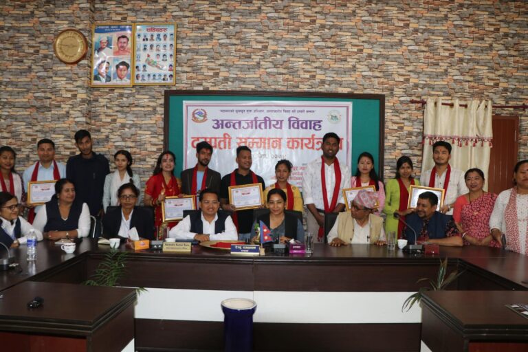 जातीय विभेद हटाउने उद्देश्यका साथ अन्तरजातीय विवाह गर्ने सात जोडीलाई नगद १ लाख पुरस्कार र सम्मानपत्रसहित सम्मान गरिएका महानगर प्रमुख रेणु दाहालले बताईन् ।