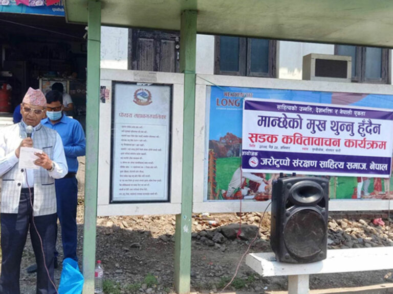 गण्डकी, २६ चैत । जरोटुप्पो संरक्षण साहित्य समाज नेपालको आयोजनामा शनिबार पोखरामा ‘मान्छेको मुख थुन्न हुँदैन’ सडक कविता वाचन गरिएको छ । संविधानभन्दा माथि कोही नहुने र पछिल्लो समयमा देशमा भइरहेका विभिन्न घटनाक्रमको साङ्केतिक विरोधस्वरुप पृथ्वीचोकको गोलघर अगाडि उक्त कविता वाचन गरिएको संस्थाका महासचिव मदन भण्डारीले जानकारी दिए ।