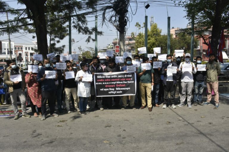 काठमाडौं, २९ चैत्र । चिकित्सा शिक्षा आयोगले सर्वोच्च अदालतको आदेशको अवज्ञा गर्दै भर्ना प्रक्रिया सुरु गरेको भन्दै चिकित्सकहरु प्रदर्शनमा उत्रिएका छन् । एमडी, एमएस, एमबिबिएसको भर्नामा आयोगले सर्वोच्चको आदेशको अवज्ञा गरेको, मेहनत र मेरिटको सम्मान नगरेको भन्दै शान्तिपूर्ण प्रदर्शन गरेका हुन् ।
