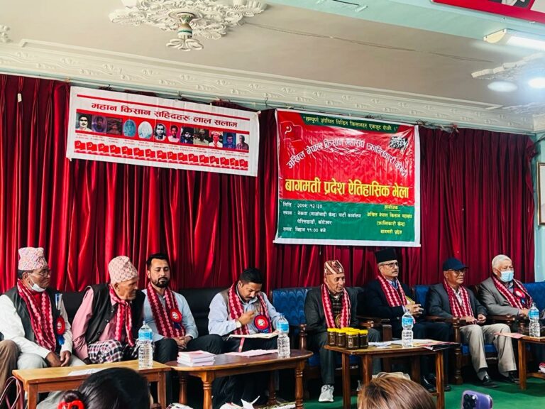 काठमाडौं, १ वैशाख । अखिल नेपाल किसान महासंघ (क्रान्तिकारी केन्द्र) बागमती प्रदेशको दोस्रो भेला सम्पन्न भएको छ । हिजो (बिहीबार) काठमाडौंमा सम्पन्न भएको भेलाले रामप्रसाद दाहालको अध्यक्षतामा १५१ समिति गठन गरेका छ । कार्यक्रमका प्रमुख अतिथि नेकपा (माओवादी केन्द्र) का उपमहासचिव एवं प्रधानमन्त्री पुष्पकमल दाहाल ‘प्रचण्ड’ का मुख्य राजनीतिक सल्लाहकार हरिबोल गजुरेल रहेका थिए । सुनिलकुमार मानन्धर, अखिल नेपाल किसान महासंघका केन्द्रीय अध्यक्ष चित्रबहादुर श्रेष्ठ, महासचिव नहेन्द्र खड्का, माओवादी बागमती प्रदेश अध्यक्ष एवं बागमती प्रदेश सभा सदस्य सरल सहयात्री पौडेललगायतले मन्तव्य राखेका थिए ।