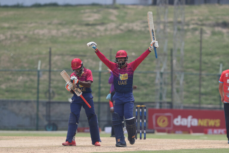 कप्तान म्हमद वासिम ८ रनमा आउट भएपछि दवावमा परेको युएईलाई भृत्य अरविन्द र रोहन मुस्ताफाले उत्कृष्ट पारी खेल्दै ३७१ रनको विशाल योगफल बनाए । १४७ बलको सामना गरेका अरविन्दले ९ छक्का र १७ चौक्काको मद्दतलमा अरविन्दले १८५ रन बनाए । त्यस्तै १२५ बलको सामना गर्दै मुस्ताफाले ४ छक्का र १० चौकाको मद्दतमा ११८ रनको योगदान गरे भने आसिफ खांले ९ बल खेल्दै ३० रनको योगदान दिए ।