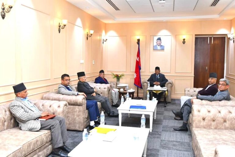 काठमाडौं, ११ बैशाख । प्रमुख दलका शीर्ष नेताहरु सिंहदरबारमा छलफलमा जुटेका छन् । प्रधानमन्त्री एवम् नेकपा (माओवादी केन्द्र) का अध्यक्ष पुष्पकमल दाहाल, नेपाली कांग्रेसका सभापति शेरबहादुर देउवा र नेकपा (एमाले) का अध्यक्ष केपी शर्मा ओलीबीच प्रधानमन्त्रीको कार्यालयमा भेटवार्ता भएको हो । सो क्रममा संसदीय समितिहरूको नेतृत्व र टिआरसी विधेयक लगायतका विषयमा छलफल भएको बताईएको छ ।