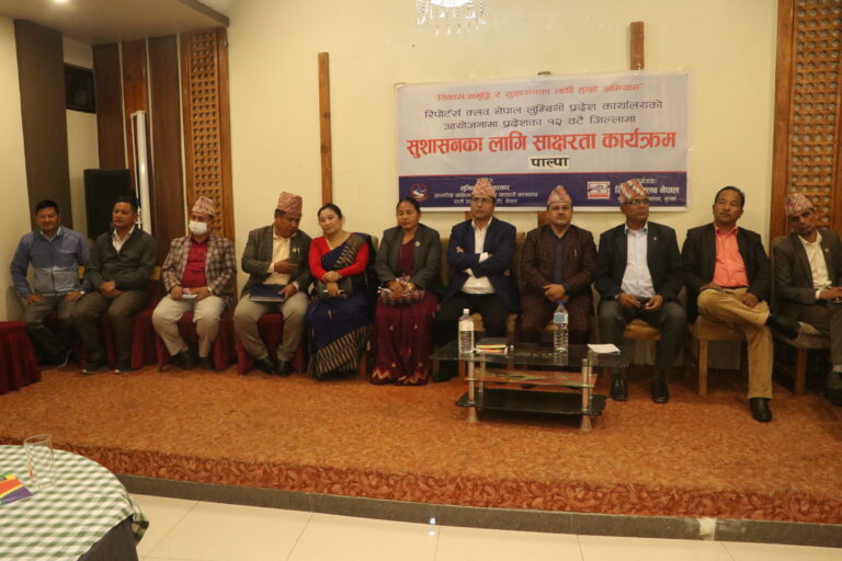 पाल्पा, १० वैशाख । विकास,समृद्धि र सुशासनका लागि हाम्रो अभियान मुल नाराका साथ रिपोर्टर्स क्लव नेपाल लुम्बिनी प्रदेश कार्यालय बुटवलको आयोजनामा र लुम्बिनी प्रदेश आन्तरिक मामिला कानून तथा सहकारी मन्त्रालयको सहयोगमा सुशासनका लागि साक्षरता कार्यक्रम पाल्पामा सम्पन्न भएको छ । प्रदेशका १२ वटै जिल्लामा सञ्चालन हुने साक्षरता कार्यक्रम पाल्पामा दोस्रो चरणमा सम्पन्न भएको हो ।