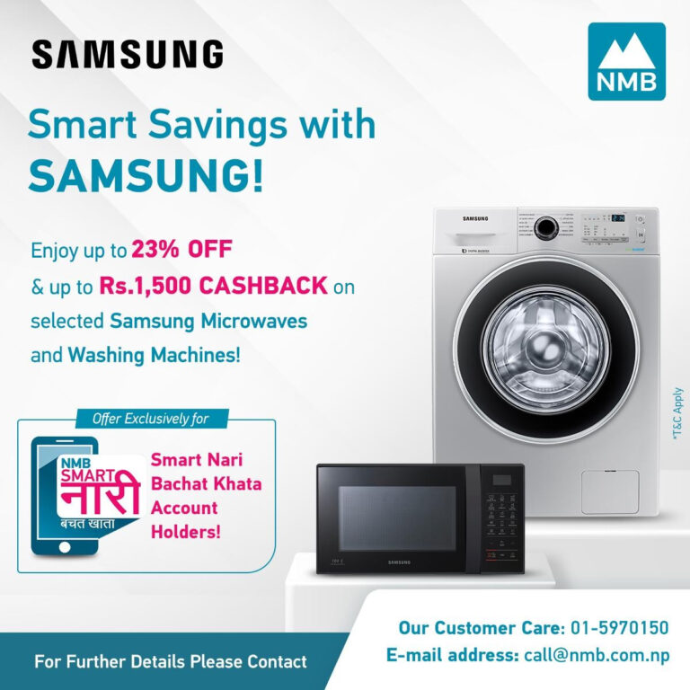 उक्त साझेदारीको उद्देश्य ग्राहकहरूलाई नवीनतम र सबैभन्दा एड्भान्स घरेलु उपकरणहरूमा पहुँच सुनिश्चित गर्ने हो । यस अफरमार्फत, एनएमबि बैंकका ग्राहकहरूले पर्याप्त छुटको मजा लिँदै सामसुङको उच्च गुणस्तरको वासिङ मेसिन र माइक्रोवेभ ओभनहरूबाट सजिलै आफ्नो घर अपग्रेड गर्न सक्नेछन् । यो अफर प्राप्त गर्नका लागि ग्राहकसँग एनएमबि स्मार्ट नारी बचत खाता हुनुपर्छ । यो अफर सीमित अवधिको लागि मान्य छ ।