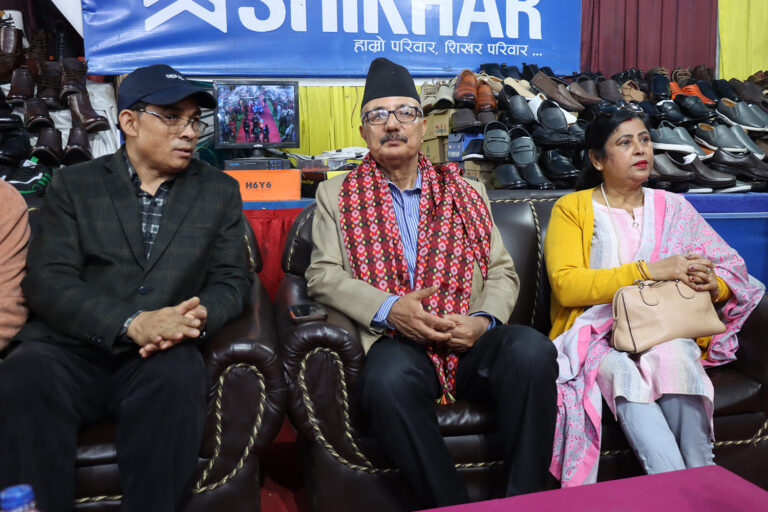 मन्त्री रिजालले मेलाको अवलोकन गरेपनि जुत्ता नै खरिद गर्छन् भन्ने आयोजकलाई लागेको थिएन । मन्त्री रिजालले आफ्नो लागि ३ जोर जुत्ता खरिद गरेपछि आयोजक उत्साही भएका थिए । Photo by: Gopal Shrestha/Reporters Nepal