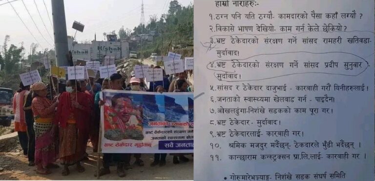 रामेछापबाट प्रतिनिधि सभा सदस्यमा निर्वाचित सांसद तामाङको कान्छाराम कन्स्ट्रक्सनले ठेक्का लिएको ओखलढुंगा सदरमुकामदेखि निशंखेसम्मको सडक अलपत्र भएका भन्दै स्थानीयहरु आन्दोलनमा उत्रिएका हुन् । उनीहरुले विभिन्न ११ बुँदे मागहरु सार्वजनिक गरेका छन् ।