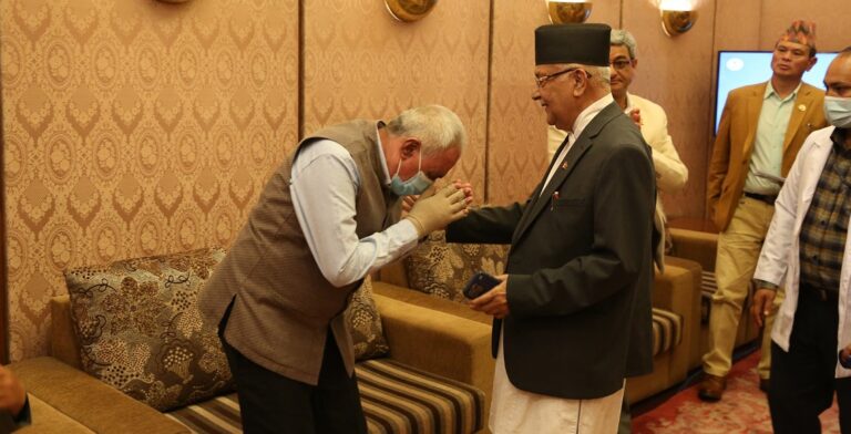 काठमाडौं,१० जेठ । नेकपा एमालेका अध्यक्ष केपी शर्मा ओलीले स्वास्थ्यलाभ गरिरहेका नेपाली कांग्रेसका सांसद डा.चन्द्र भण्डारीलाई भेटेका छन् ।