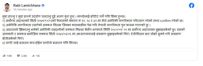 १.सर्वोच्च अदालतको मिती २०७९-१०-१३को फैसलाको प्रकरण नं.२२, २८ र ३२ मा मैले अमेरिकी नागरिकता परित्याग गरेको तथ्य उल्लेख गरेको छ।