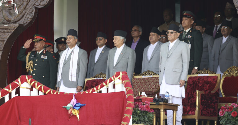 काठमाडौँ, १५ जेठ । राष्ट्रपति रामचन्द्र पौडेल १६औँ गणतन्त्र दिवसका अवसरमा सैनिक मञ्च टुँडिखेलमा आयोजित विशेष समारोहमा सरिक भएका छन् ।