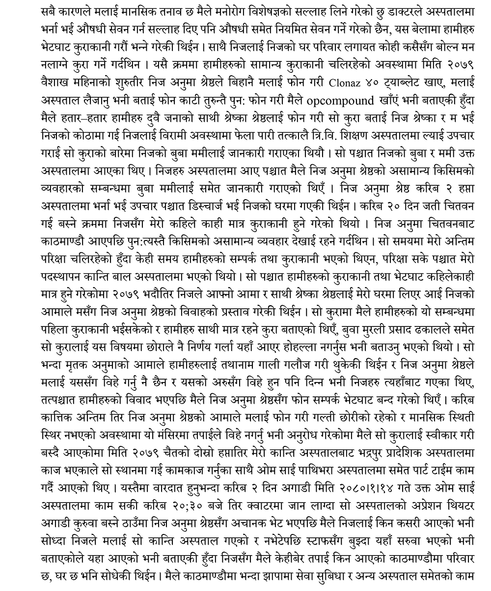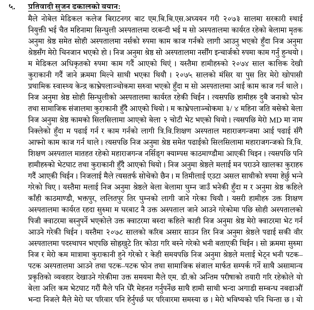 बयानका क्रममा प्रतिवादी सुजनले २०७३ सालदेखि अनुमासँग चिनजान रहेको बताएका छन् । त्यतिबेला सरकारी नियुक्ति पाएर सिन्धुली अस्पतालमा काम गर्ने क्रममा त्यही नर्स रहेकी अनुमासँग चिनजान भएको उनको भनाइ छ ।