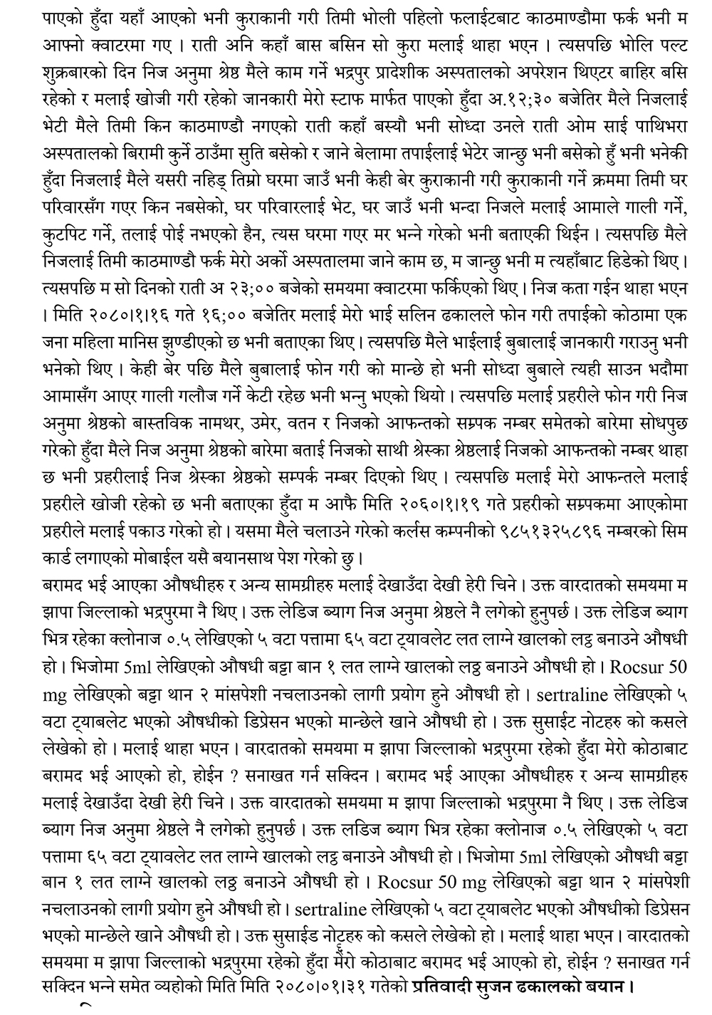 मृतक श्रेष्ठले प्रतिवादी ढकाल आफ्नो प्रेमी भएको र विहे गर्ने आश्वासन दिएर पटक-पटक गर्भपतन गराएको सुसाइड नोटमा उल्लेख गरेको प्रहरीले जनाएको छ ।