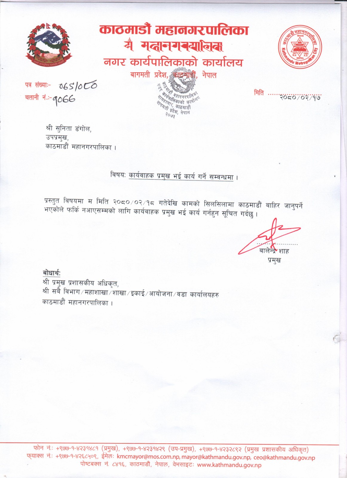 बालेनले भारत भ्रमणमा गएपछि महानगर प्रमुखको जिम्मेवारी उपप्रमुख सुनिता डंगोललाई दिएका छन्।