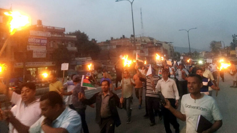 काठमाडौं, २१ जेठ । नेकपा (एमाले) निकट युवा संगठन सरकार र राष्ट्रपतिविरुद्ध जिल्लाभर मसाल जुलुश निकालेको छ । एमाले पोलिटव्युरो सदस्य महेश बस्नेतको गृहजिल्ला भक्तपुरमा प्रधानमन्त्री पुष्पकमल दाहाल र राष्ट्रपति रामचन्द्र पौडेलविरुद्ध युवा संगठनले मसाल जुलुस निकालेको हो ।