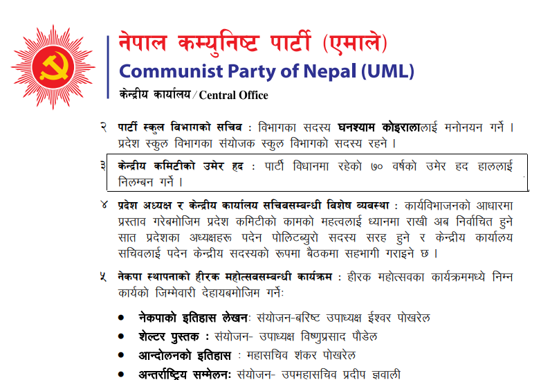 काठमाडौं, २४ जेठ । नेकपा (एमाले) ले ७० वर्षे उमेर हद हटाएको छ । एमाले सचिवालयको बैठकले कार्यकारिणी समितिमा लाग्ने उमेर हद हटाएको हो । एमालेको विधानमा सबै तहको कार्यकारी कामिटीको पदाधिकारी र सदस्यमा निर्वाचित वा मनोनित हुनका लागि ७० वर्ष उमेर पूरा नभएको हुनपर्ने व्यवस्था छ ।