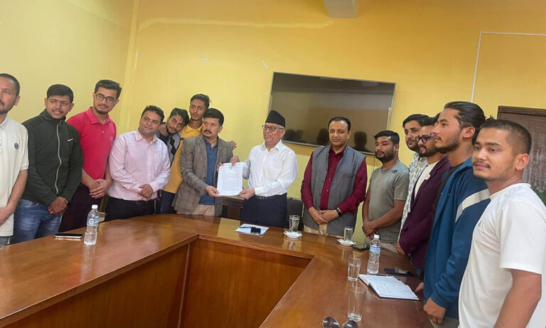 काठमाडौं,२९ जेठ । त्रिभुवन विश्वविद्यालयका बेथिति सुधारको माग गर्दै नेकपा एमाले निकट विद्यार्थी संगठन अखिल नेपाल राष्ट्रिय स्वतन्त्र विद्यार्थी युनियन (अनेरास्ववियु) ले त्रिविका उपकुलपति प्रा डा.धर्मकान्त बाँस्कोटालाई ज्ञापन पत्र बुझाएको छ ।