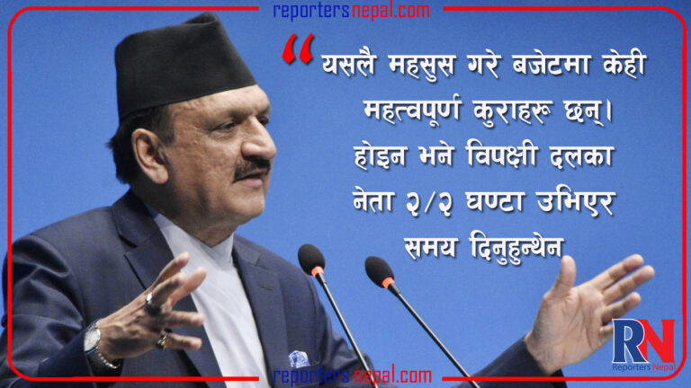 ‘स्वयम् विपक्षी दलका नेता तथा पूर्वप्रधानमन्त्री केपी शर्मा ओलीज्यूले मैले प्रस्तुत गरेको करिब ३ घण्टाको प्रस्तुतिमा उहाँले २ घण्टाको टिप्पणी राख्नुभयो,’ उनले थपे, ‘यसले मैले के महसुस गरेको छु भने यो बजेटमा केही महत्वपूर्ण कुराहरू छन्। यसले केही नयाँ कुराहरू अघि बढाउन कोसिस गरेको छ। होइन भने विपक्षी दलका नेता २/२ घण्टा उभिएर समय दिनुहुन्थेन।’