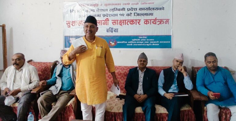लुम्बिनी, २९ जेठ । प्रतिनिधिसभा सदस्य तथा पूर्वमन्त्री सन्जय गौतमले सुशासन कायम गर्न आ-आफ्नो स्थानबाट सम्पूर्ण निकायहरु जिम्मेवार बन्नुपर्ने बताएका छन् । रिपोर्टर्स क्लव नेपाल लुम्बिनी प्रदेश कार्यालय बुटवलद्धारा आयोजना र लुम्बिनी प्रदेश आन्तरिक,कानुन तथा सहकारी मन्त्रालयको सहयोगमा बर्दियामा आयोजित सुशासनका लागी साक्षात्कार कार्यक्रममा बोल्दै पूर्वमन्त्री गौतमले सुशासनको हकमा तीनै तहका सरकार कमजोर भएको बताए ।