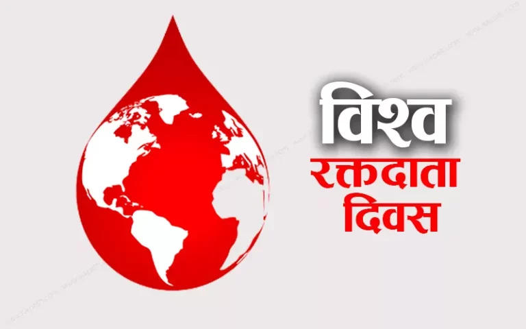 काठमाडौँ, ३१ जेठ । आज विश्व रक्तदाता दिवस नेपालमा पनि विभिन्न सचेतनामूलक कार्यक्रम गरी मनाइँदैछ । हरेक वर्षको जुन १४ का दिन विश्वभरका देशले विश्व रक्तदाता दिवस मनाउने गर्छन् । यस दिवसमा सुरक्षित रगत र रगत उत्पादनको आवश्यकताबारेमा सचेतना जगाउन र रक्तदान गर्न प्रेरित गर्दै आइएको छ । रक्तदातालाई धन्यावाद दिने दिनका रूपमा पनि मनाउने गरिन्छ ।