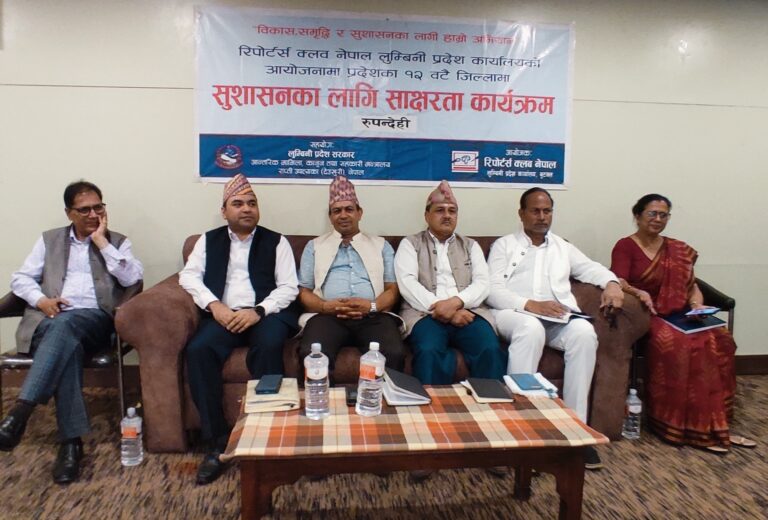रिपोर्टर्स क्लब नेपाल लुम्बिनी प्रदेशका अध्यक्ष रामकुमार क्षेत्रीको अध्यक्षतामा सम्पन्न भएको कार्यक्रममा सुशासन अभियान्ता महेन्द्र पाण्डेले कार्यपत्र प्रस्तुत र पत्रकार नारायण वलीले कार्यक्रमको संचालन गरेका थिए।