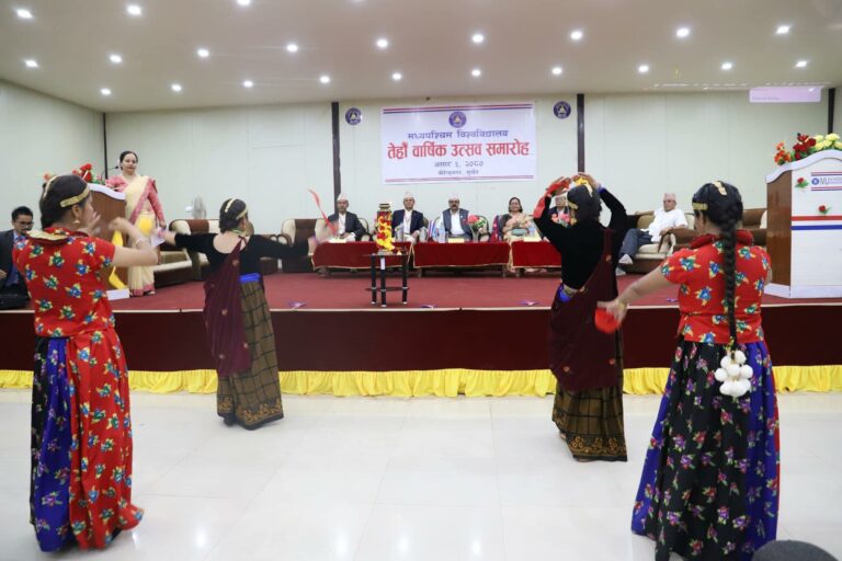 सुर्खेत, असार ४ । मध्यपश्चिम विश्वविद्यालयको तेह्रौं वार्षिकोत्सव समारोह सम्पन्न भएको छ । प्रदेशका मुख्यमन्त्री राज कुमार शर्माको प्रमुख आतिथ्य र मध्यपश्चिम विश्वविद्यालयका उपकुलपति प्रा डा. नन्दबहादुर सिंहको अध्यक्षतामा वार्षिकोत्वस कार्यक्रम सम्पन्न भएको हो ।