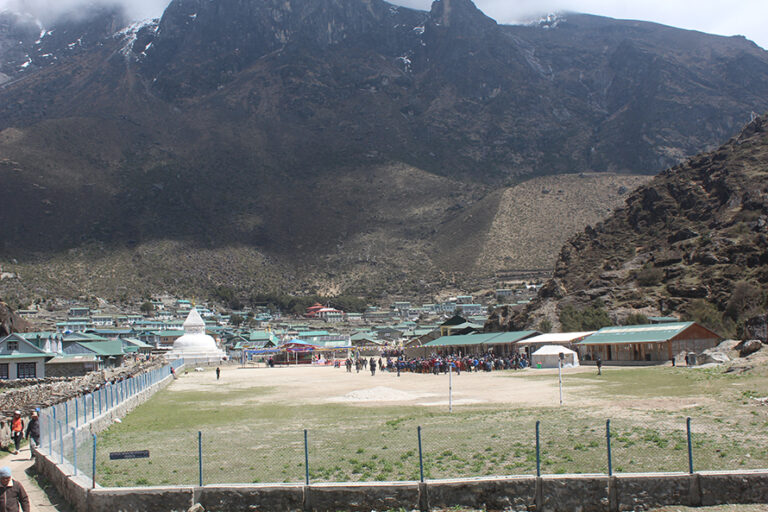 नाम्चेबाट करिब २ घण्टाको हिडाईपछि स्याङबोचे कट्ने बित्तिकै सबैको मुखबाट “आहा” शब्द निस्किन्छ । कारण हो टाढैबाट देखिने हरियो गाउँ खुम्जुङ्ग । सेतो गुराँसले स्वागत गर्दै यो उपत्यका प्रवेश गर्नेको सबै थकान र पिडा मेटाइदिने गरेको छ । चारैतर्फ हिमालले घेरिएको खुम्जुङ्ग, खुम्बु क्षेत्रको प्रसिद्ध पर्यटकीय स्थल पनि हो । प्रायः सबै घर हरियो जस्ता पाताले छाएको कारण यसले हरित गाउँको नामले समेत पहिचान कमाएको छ । खुम्बिह्यूला, आमादम्बलामलगायत हिमालका काखैमा रहेको यो गाउँ पर्यटकहरुको रोजाईमा पर्ने गरेको छ ।